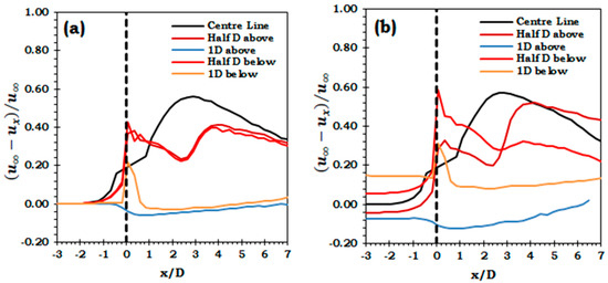 Velocity deficit along the length of the channel at different channel depths for (a) uniform velocity; (b) velocity profile.