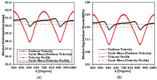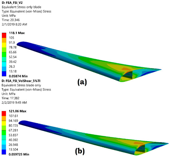 Contour plot of blade equivalent stress for (a) uniform velocity; (b) velocity profile.