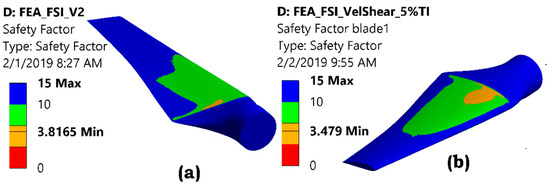 Figure 16 shows the stress state of the blade for uniform velocity and velocity profile. The green color corresponds to a biaxiality indication of (0) indicating a uniaxial stress state at a majority of the blade. The blue color with a biaxiality indication of (−1) indicates a pure shear and red with a biaxiality indication of (1) represent a pure biaxial state. The contour plot clearly shows that the major portion of the blade is in a uniaxial stress state (green color) and S-N data for torsional loading is not required for the fatigue analysis of turbine blades. Figure 17 shows that for the uniform velocity the fatigue factor of safety is 3.8. The additional effect of velocity profile has reduced the fatigue factor of safety by about 8% to a value of 3.5. It is important to note that although this study utilized a near to real turbine design but only the hydrodynamic conditions of velocity profile is modeled with contribution to the fatigue failure of blades. But other important contributors, like turbulence and waves, etc., will also contribute to deciding the final fatigue life of the blade.