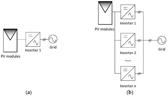 Topologies of high power central inverters. (a) Centralized inverter composed by a single power stage; (b) centralized inverter composed by n parallel modules.