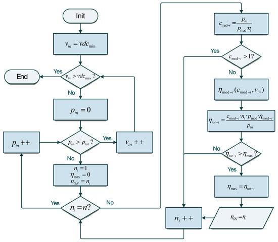 Efficiency curves calculated by means of the Jantsch model. (a) Perfect Galaxy International Ltd. EQX0250UV480TN. (b) Power-One ULTRA-750-TL-OUTD-4-US (c) Power Electronics FS0900CU.