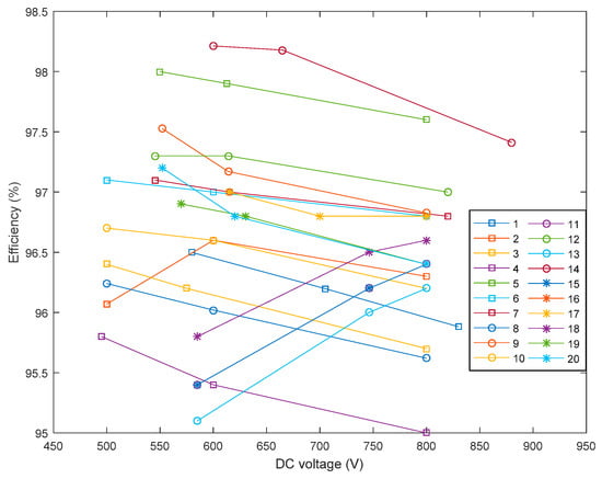Relationship between the input voltage and the efficiency of the inverters extracted from the CEC Grid Support Inverters List.