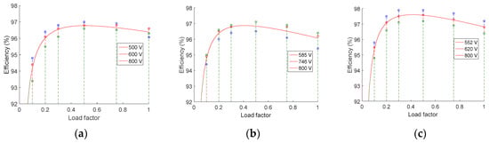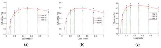 Efficiency curves calculated by means of the Dupont model. (a) Perfect Galaxy International Ltd. EQX0250UV480TN. (b) Power-One ULTRA-750-TL-OUTD-4-US. (c) Power Electronics FS0900CU.