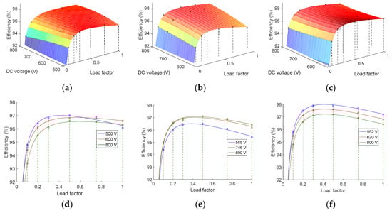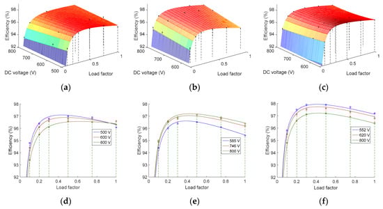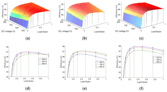 Efficiency surfaces and detail of curves for three values of the DC voltage calculated by means of the Driesse model. (a,d) Perfect Galaxy International Ltd. EQX0250UV480TN. (b,e) Power-One ULTRA-750-TL-OUTD-4-US. (c,f) Power Electronics FS0900CU.