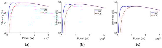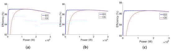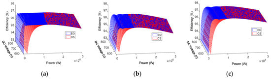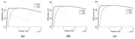 Efficiency of Power Electronics FS0900CU with average current-sharing control method (CS) and efficiency-oriented method (EO). (a) 552 V. (b) 620 V. (c) 800 V.