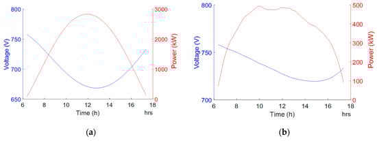 Daily power generation and MPPT voltage curves. (a) Sunny day. (b) Cloudy day.