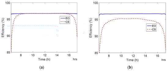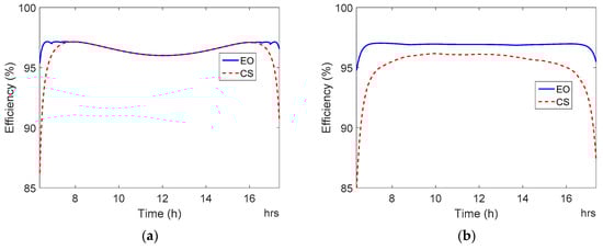 Daily efficiency curves of Power-One ULTRA-750-TL-OUTD-4-US with average current-sharing control method (CS) and efficiency-oriented method (EO). (a) Sunny day. (b) Cloudy day.