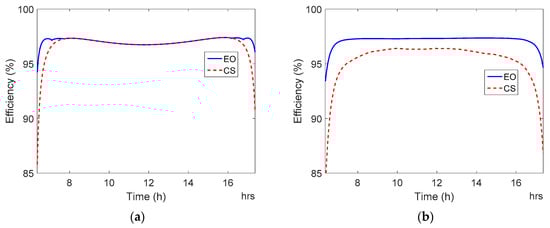 Daily efficiency curves of Power Electronics FS0900CU with average current-sharing control method (CS) and efficiency-oriented method (EO). (a) Sunny day. (b) Cloudy day.