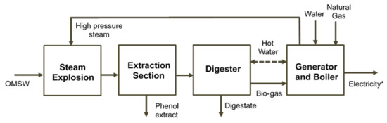 Bio-refinery scheme consisting of steam explosion solubilization, phenol recovery, anaerobic digestion and a cogeneration system. * Net electricity production after subtracting the total electricity consumed from the electricity produced.