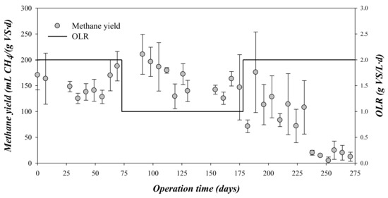 Variation of the methane yield and the organic loading rate (OLR) during the experimental time.