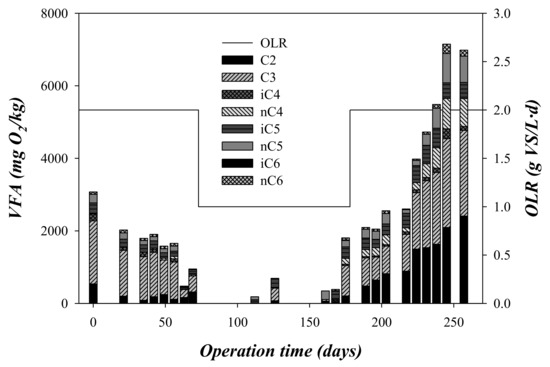 Variation of the VFA and the organic loading rate (OLR) with the operation time.