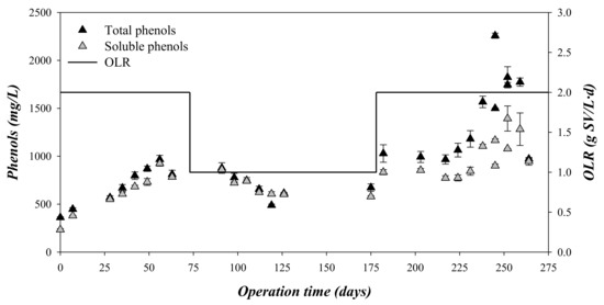 Variation in the total and soluble phenols and the organic loading rate (OLR) with the operation time.