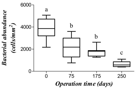 Bacterial abundance at distinct operation times. Boxes with distinct letters are significantly different (p < 0.05, one-way ANOVA plus Tukey post-hoc test).