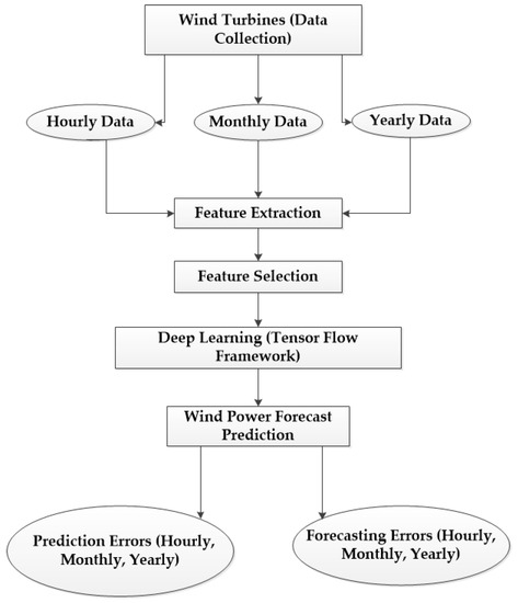 Large-scale wind power forecasting is the main focus of many researchers [35]. The most useful approach is to forecast power production over different regions based on hourly, monthly and yearly historical data collected from wind turbines. In this paper, we have proposed a hybrid approach of optimized deep learning and PCA to forecast the wind power for large-scale historical data. First, PCA is used to expose the hidden patterns and to retain the most significant information [18,36]. PCA is applied to the historical wind data over the entire grids and eigenvalues and eigenvectors are calculated. This reduces the matrix size by focusing on the critical features and removing noisy data. TensorFlow is an online open source software library for numerical computation using dataflow graphs. The optimized deep learning algorithm using TensorFlow is applied to the reduced data features to predict the forecasting errors [37]. It uses a neural network to predict the relationship between data features. The wind power depends on the cubic of the wind speed, as it follows the wind power curve.
