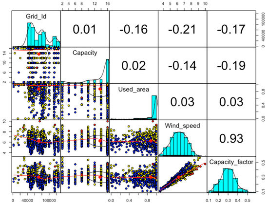 The principal components are then used as input data to deep learning based on the TensorFlow framework. PCA provides feature extraction and selection. The proposed research is examined with three different datasets collected within the NREL database in the US. These three datasets contain hourly, monthly and yearly real-time wind turbine data. First, the hourly wind dataset is collected from 20 m to 160 m distance on the ground and with a duration of 1 h, 4 h and 6 h, respectively. It contains the data of 126,000 wind farm sites with different meteorological parameters. Second, the monthly wind dataset is collected from the Hawaii region of the US with the mean of a 2 km grid in January. This data contains the cumulative average of 17 years of Modern-Era Retrospective analysis for Research and Applications (MERRA) time series data collection from different wind turbines. Third, the yearly dataset is collected from an offshore wind statistics geodatabase that captures different wind speed parameters for Hawaii. The real-time historical data is analyzed by the MERRA time series for 17 years and collected as a commutative average of the different meteorological parameters from approximately 2 km grids. The hourly wind data has highly uncorrelated data as shown in Figure 2.