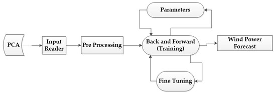 The principal components are then passed to the deep learning algorithm. TensorFlow is an open source machine learning-based repository that works in extensive heterogeneous and complex environments. It is used for a high level of computation, training data, sharing the state and the operations used to mutate the states by dataflow graphs. It enables presentation of computations on each node that may own or renew the mutable state in a dataflow graph. TensorFlow collects the node information from the dataflow graph in a cluster through different machines and, further, throughout numerous computational devices, for example, multicore central processing unit (CPU) and graphics processing unit (GPU). It provides a flexible environment to the application developer and allows the design of novel and optimized algorithms. It provides different types of applications for inference and to train the deep neural network. It works mainly in three steps: First, processing the data; second, designing the model; and, third, training and estimating the designed model. TensorFlow performs computations using multidimensional arrays called tensors. These are base datatypes which provide generalization of matrices and vectors. It describes the different properties of the physical system. The tensors are calculated asynchronously for the data using a queues feature. These queues work like multi-threading technology in parallel to can speed up the operation [41,42]. We used TensorFlow with the Keras application programming interface (API) to design a complex neural network for wind power forecasting. Keras is a high-level API that is used to train the deep learning models. It is user-friendly and used for fast prototyping and new modular extensions [43]. The PCA data is given as an input to the TensorFlow framework. First, data is preprocessed and then queued for the training phase as shown in Figure 4.