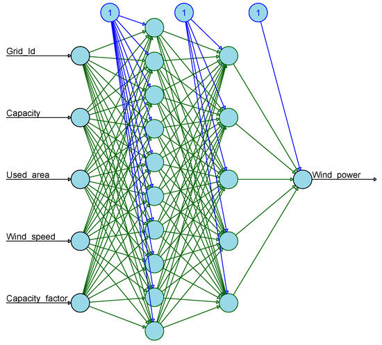 The back and forward method are used to train the threads in a loop-like process to fine tune the different parameters. The fine-tuning procedure is optimized with a different activation and loss function, dropout layer, optimizer and learning rate. This process is used to obtain better accuracy of the wind power forecast. The grid id, capacity, used area and wind speed are the input variables and the wind power forecast is the output variable. There are ten neurons in the first hidden layer and five neurons in the second hidden layer. All input values are preprocessed and trained using the TensorFlow-based deep learning framework and then wind power forecast is predicted for hourly wind turbine data as shown in Figure 5. The sigmoid method represents the nonlinear form of the neural network model. The neural network calculates the linear arrangement of input signals and then applies a sigmoid activation function to the outcome. It is a standard logistic activation function which is used for handling multi-class problems [44]. Mathematically it can be defined using Equation (6).