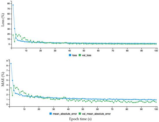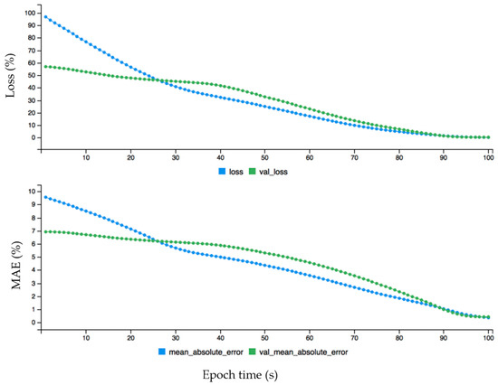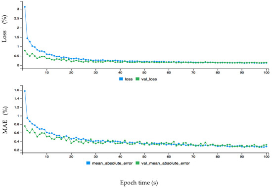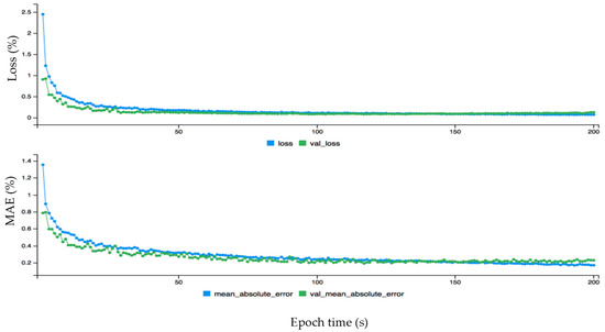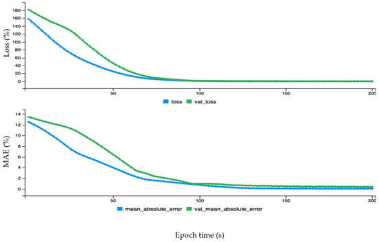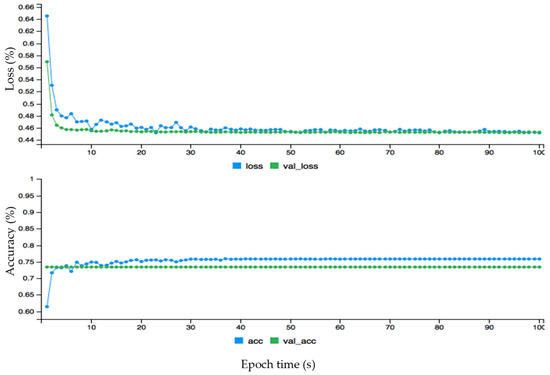 where denotes the sigmoid function and is the exponential function for a variable . The entropy function is used to detect the loss to compile the deep learning model. It accepts a tensor as an input and targets the tensor with the same shape as the output. The Adam optimizer, which is also known as the stochastic descent gradient, is used for compiling and optimizing the deep learning model. It uses the iterative procedure to update the network weights and calculates the individual adaptive learning rates for each parameter in the deep learning network [45,46]. The decaying means of pas squared gradients are shown in Equations (7) and (8) [47].