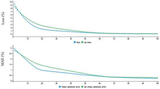 There is a total of 6733 trained parameters, of which 600 in the first layer, 5050 in the second layer and 1020 are in the third layer. The four-dense layer is used for the target variable in which 63 parameters are trained. The same methods are applied to all three datasets. The goal is to train the input variables in layers 1, 2 and 3 to target the output variable in layer 4. The model was complied with 100 epochs for loss and prediction accuracy, and the resultant dynamic graph for hourly wind data is given in Figure 6. The epoch values are given on axis and loss, and accuracy is given on the y-axis.