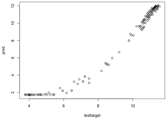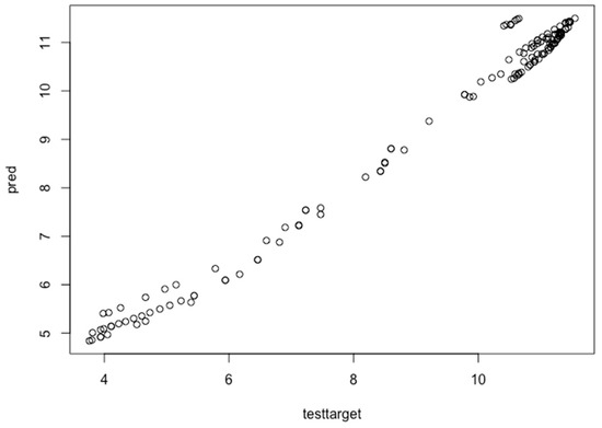 The black circles represent the relationship between the actual data (testtarget) and the predicted data (pred). First, the curve increases on the x-axis up to 6 epochs, but after switches to the y-axis. The graph is not in a linear form, and it needs fine-tuning configuration to predict the wind forecast accurately and to remove the overfitting. The fine-tuned chart for hourly wind turbine data is shown in Figure 14.