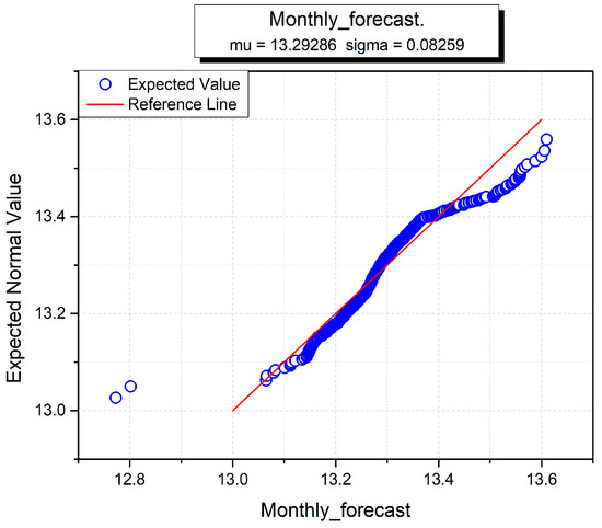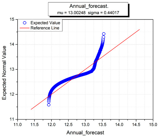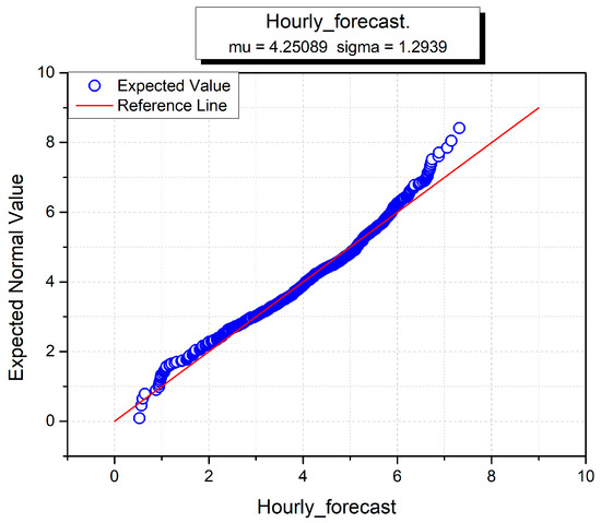 The hourly, monthly and yearly wind turbine data for forecasting wind power are given in Figure 15, Figure 16 and Figure 17. The sigma (standard deviation) and mu (mean) are used to analyze the normal distributions of all input variables against the hourly forecast, monthly forecast and yearly forecast predictions [54]. In all three figures, hourly, monthly and annual forecasts are given, and the estimated normal distributions are shown on the y-axis. It is used to test the distribution and normality of data instances of individual datasets. The red line shows the standard normal form and the blue line conforms to the data instance in all three figures. The sigma and mu standard functions are used to investigate the normal distribution of each wind dataset. The blue curve indicates the corresponding wind turbine data, and the linear red line shows the standard normal distribution against the x-axis. At the start, the hourly curve behaves better than the monthly and yearly curves, but soon after takes a nonlinear form against the standard distribution. Overall, the annual curve performs worse than the other two curves because it neither starts nor ends towards the standard distribution line. The monthly curve is better than the others, which demonstrates that monthly wind power prediction accuracy is greater than fir the other two datasets.