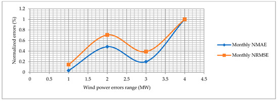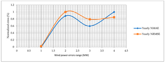 The normalized mean absolute error (NMAE) and normalized root mean square error (NRMSE) are calculated for the proposed approach and other state-of-the-art algorithms. The RMAE and NRMSE for the hourly, monthly and yearly wind power forecast graphs are shown in Figure 18, Figure 19 and Figure 20. The blue line shows the normalized NMAE and the orange line shows the NRMSE. The normalized errors are calculated in a range of 0 to 1 on the y-axis. The wind power error range is different in each figure, which indicates the minimum and maximum limit of each wind power error on the x-axis. The NRMSE is always higher than the RMSE, which indicates that the wind power forecasting errors are precise and accurate. Overall, the hourly normalized errors behave the same because both curves almost have the same direction. Secondly, the normalized errors for the monthly wind power forecasting perform better.