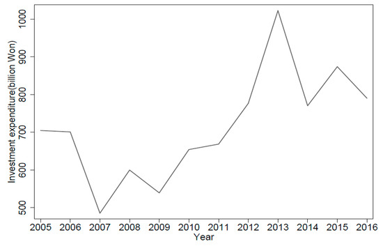 Studies assessing the effects of environmental regulations not the proxy variables are scarce in case of Korea, because domestic environmental regulations are not strict. The Low-Carbon Green Growth (LCGG) Act sets the fundamentals of environmental policies including the Emission Trading Scheme (ETS). Article 46 of the Act states that the introduction of a cap and trade system for emissions of GHG [2] and the pilot project for ETS was undertaken in January 2010. The carbon market will stimulate incentives for firms to reduce their emissions; as previously announced the Act was implemented in 2015. The GHG Inventory and Research Center was also established to construct GHG data and manage emissions according to Article 45 [2,31]. Lee and Choi [30] show that ETS implemented in 2015 promoted technical changes in the manufacturing industry, but this top-down approach by the government may have limits in enhancing environmental efficiency. Jung [29] suggests that LCGG was based on economic growth rather than ecological modernization and green jobs were only created in traditional environmental protection and pollution reduction areas. While this government-initiated project for achieving both economic growth and environmental conservation has been controversial [32], environmental and energy expenditure in the country reflects increased investments in the environmental parts (see Figure 1). We can directly analyze the effects of environmental regulations by dividing periods into before and after LCGG.