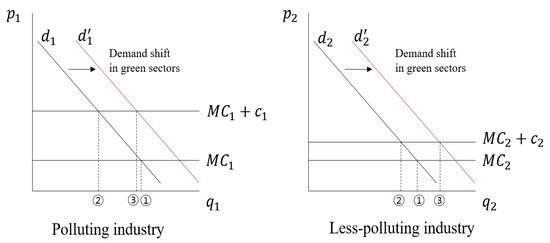 This section examines the mechanisms of how regulations affect a firm’s performance and the related hypotheses. It is obvious that environmental policies increase firms’ production costs directly. But this impact is asymmetric to economic units and depends on the differences in their production functions and the demand that they face. This means that besides divisions between regulation-targeting groups and others, systematic differences between the entities also lead to changes in relative costs. The Pollution Haven Hypothesis is also based on the asymmetric effects of environmental regulations between countries [24]. Figure 2 illustrates the asymmetric effects of environmental policies on a firm (or industry). Here and indicate each sector’s compliance costs brought on by environmental regulations. Since the polluting industries have a higher cost burden of environmental regulations as compared to the less-polluting industries, they have higher compliance costs ().