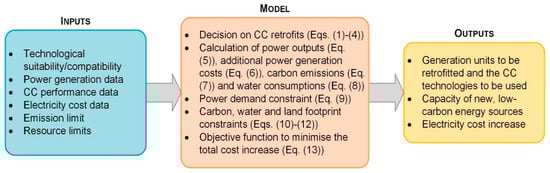 The objective function is to minimise the total cost increase, which consists of the additional cost incurred by CC retrofits and the cost of power generation using new, low-carbon energy sources, as given in Equation (13).