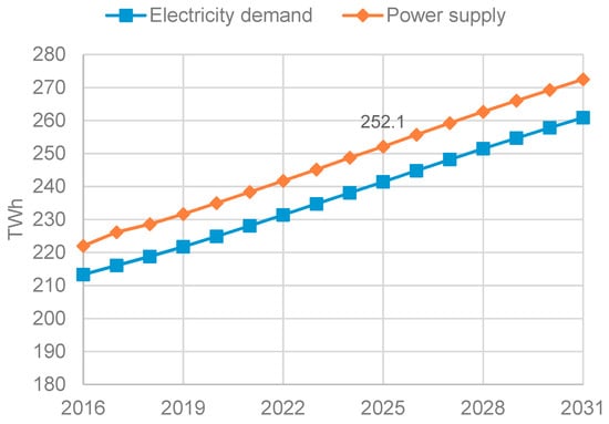 Forecast electricity demand and power supply for 2017–2031 (pumping energy excluded).