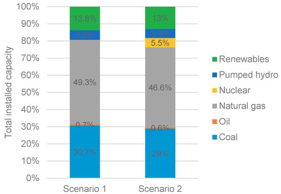 Table 2 shows the baseline energy mix in 2025, based on Taipower’s long-term power development plan []. The capacity factors are determined from Taipower’s 2013–2017 statistical data [] or taken from NREL estimates (for small hydro, offshore wind and geothermal) []. Given the controversy over nuclear power, two scenarios (with and without the use of the fourth nuclear power plant) are considered in this case study. Figure 4 shows that in both scenarios, thermal power plants using coal, oil and natural gas comprise more than 75% of the total installed capacity. This indicates the need for CCS and the expansion of RE in order for the electricity sector to meet the emissions limit (92 MtCO2e) and the required power supply of 252.1 TWh (see Figure 2) in 2025. Please note that the load forecast in Figure 2 does not include pumping energy, which is about 2% of the power supply []. Therefore, the overall energy demand to be satisfied in 2025 is 257.1 (= 252.1 × 1.02) TWh.