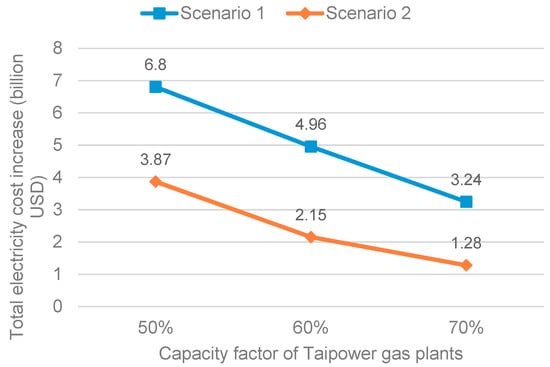 In addition, the results demonstrate the role of nuclear power as an economical low-carbon option in energy transition. The use of nuclear energy reduces the need for additional power generation capacity from renewables in 2025, thus relieving the pressure to achieve ambitious RE targets in the medium term. This might seem to delay the deployment of renewables, but is actually to buy time for RE technologies to be deployed progressively in the long term, without major impacts on grid stability and electricity cost. With similar effects, increasing the capacity factor of load-following (i.e., gas-fired) power plants reduces the operating reserve, and hence grid flexibility, while causing difficulties in maintenance scheduling. Therefore, the preferred strategy would be to use nuclear energy with gas-fired plants operating at optimised capacity factors. It should be noted that there is no direct comparison between the results for scenarios 1 and 2, because of the different baseline conditions. However, the total levelised annual cost of nuclear power generation can be estimated to be 0.68 billion USD (= 2.7 × 106 kW × 8760 h × 0.901 × 0.032 USD/kWh), which is less than the difference in the resulting electricity cost increase between scenarios 1 and 2 (see Figure 5). This indicates the economic benefit of nuclear energy in this specific case. As is the case for all energy technologies, nuclear power has its pros and cons, which would imply the incorporation of further environmental indicators in the planning for a sustainable energy mix.