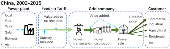 Various countries around the world, including China, are reforming their electricity market to achieve sustainable development. Experience shows that those market reforms characterized by FIT-based competitive biddings and the open-access of transmission grids have become mainstream practices of reformation and development efforts. Since issuing the “Electricity Power System Reform Program” by the State Council of the People’s Republic of China in 2002, China had been undergoing the power system reform for 13 years. Until 2015, China’s power industry had realized a separation of power plants from the electric grids with FIT-based competitive bidding [33]. Figure 1 depicts a simplified diagram in China’s electricity market and shows that customers had only one alternative to purchase electricity and the electricity price was dependent on layers of additional value and national pricing strategies for different end users.
