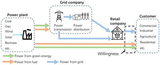 In order to solve these problems, in May 2013, the State Council approved a proposal entitled “The Guideline of Major Tasks to Deepen Economic Structure Reform in 2013.” In this document, “promotion of direct electricity purchase for big users” and “reform demonstration projects of electricity marketing” were first proposed [36]. These strategies broke the electric grid monopoly and allowed end users to access the electricity market. Furthermore, in March 2015, the central government issued an important reforming policy entitled “Some Suggestions for Further Deepening Power System Reform” [37]. The policy highlights the key problems involved in the existing electricity market, such as the deficiency of trading mechanisms and the mismatch between trading partners. The proposal clearly presents an orderly reform on electricity prices, an improvement to the marketization and a steady advancement of electricity sales reformation. The proposed reform seeks to establish a reasonable and effective power market system so that the market may play a decisive role in the deployment of power resources and may save more energy [38]. Since the middle of 2015, two important measures of policy adjustments in the reform are (1) active promotion of effective connections of power generation from green/renewable energy sources to grids; (2) separation of electricity sales from a distribution with a market-decision pricing mechanism, as shown in Figure 2. This Figure shows that after China’s power policy reform, customers have more choices to purchase electricity, even directly from power plants. They may choose to use the GEPs according to their personal willingness, as well. Because of these alternatives, this research has a more practical significance of how the consumers’ WTP to the GEPs may increase.