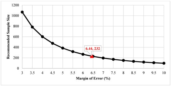To be conservative and find a sample size that is statistically significant and large enough to yield more accurate results, this study followed the recommended sampling size guidance and methods in References [40,41]. Figure 3 shows the recommended sample sizes versus a different margin of errors [40,41]. The studied sample size of 232 with a 95% confidence level and 6.4% margin of error is statistically significant to approximately represent that population behaviour. The sample probably does not accurately represent the whole population and all residents but it may be proportionally allocated into each district of Shanghai region.