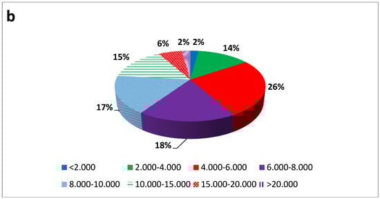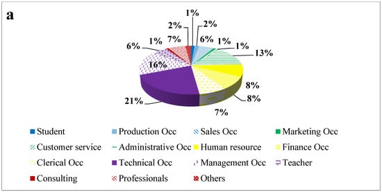 Occ and income of the respondents are shown in Figure 4a,b. The stability of the respondent’s Occ and income was 98%, meaning that for a long time their Occs and incomes have remained the same or are constant. The Occ categories indicate that the majority of the respondents knew or had the potential to learn about the GEPs. Of the respondents, 76.3% earned between 4.000 and 15.000 Yuan; thus, these people could buy the GEPs even when more expensive than electricity generated by fossil fuel, which is commonly used.