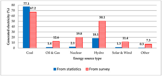 For the initial assessment of the respondents, they were questioned about their current electricity sources in the surveyed region to clarify their knowledge and awareness about those sources. The multi-choice question allowed the respondent to respond with more than one answer. To evaluate the respondents’ awareness, Figure 5 compares their responses to the real data on generated electricity in this region [69].