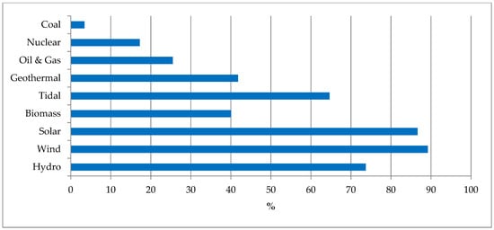 Availability of energy resources is stated as the exploitable, proven and the readiness of technologies for exploitation reserves [48]. According to Wang et al. study [48] about China’s energy resources, the availability of green energy powers is higher than coal, petroleum, natural gas and nuclear powers, respectively, 130%, 230%, 240% and 210%. This information states that renewable energy sources have great potential to generate electricity in China. The potential of hydropower, wind power and solar power in Shanghai region were estimated [49,50] 2–10 GW, 2–10 GW and 2200–3000 h/year (sunshine duration). The convergence of this information in the respondent’s mind gave an idea about the likelihood of the use of renewable energy sources: for example, by 2050, China’s renewable energy use can reach 43% of the total energy demand [51].