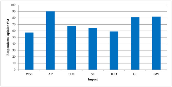 The problematic issue is that the respondents needed the information to become aware of each impact. As a consequence of this, the classified information of each environmental impact was presented. The impacts ranked according to their opinion resemble those of the official document [47], in which AP, GE and GW were figured out as the top environmental risks. The results in Figure 7 show that the people were conscious of some environmental impacts and risks due to the use of fossil fuel sources. The Figure’s results are in agreement with Wang et al. study of environmental impacts [48]. The problem was that they did not know their role in this setting.