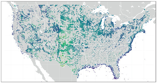 Persistence, as was expected from the literature [10], generated results that showed a steep accuracy deterioration as the time steps increase, becoming negative for some wind sites, indicating inferior predictive results at 12 h. When the results ( of each wind site for the 12-h steps) were positioned on a map, the areas with more variability of winds can be observed graphically (see Figure 3); comparing these areas with wind resource studies of the U.S. geography, (like the global wind atlas [52]), it can be observed that where the persistence ratings were rather poor, the variability of winds was very high. The most significant errors were geographically located in areas with complex terrains (Rocky Mountains) and with high wind variability (West Coast and Central Plains). As a result of this comparison, a research question arises. Is the error in persistence an indication of the terrain complexity of the site?