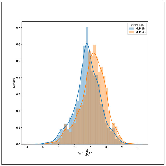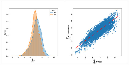 Is the accuracy constant over the years? If there are changes caused by drifting winds, seasonal weather model modifications, and climate change, then the accuracy will vary over time. With seven years of data available, five for the initial training, one year for test, and another for validation, an analysis of the accuracy evolution was made. The comparison between the test and validation datasets that used the sixth and seventh year respectively showed differences in their distributions. In this case, applying a t-test for two related samples, given that the scores were computed for the same population, resulted in a significant difference in means, as can be seen in Figure 5. Computing a linear regression for predicting the validation scores with the test scores, it gave a value of 0.97 for the weight of the test values. This means that even when there is a difference in the mean of the distributions, the model is still consistent, making the initial training still valid. The conclusion is that the wind regime changes slightly on this time frame (seven years), but not enough to interfere with the accuracy of the methods. With this result, it is not possible to establish the variability of wind over time, at least in series of seven years from 2007–2013.