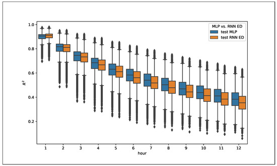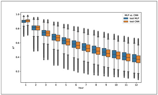 A boxplot of the distribution of for each time horizon (see Figure 6 and Figure 7) show also some relevant characteristics. The RNN and CNN models performed better in the short term (1–2 h) than the MLP ones, which showed better results in the 3–12-h interval. In this sense, it is observed that RNN and CNN are better at learning the short-term characteristics of the series, while MLP is more consistent in the full 12-h prediction. Again, the differences were small, but relevant, as calculated on the 126,692 sites, and showed a valid trend.