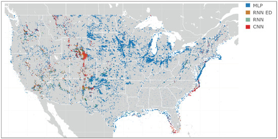 A map of the persistence accuracy across the North America geography has been presented (see Figure 3), and with all the experimental results obtained, a new map was developed showing the best architecture for each wind site (see Figure 8), allowing a graphical analysis of the results to identify geographical patterns related to architectures.