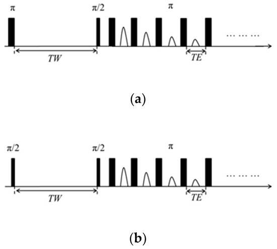 Diagrams of the inversion recovery-Carr–Purcell–Meiboom–Gill (IR-CPMG) pulse sequence (a) and the saturation recovery Carr-Purcell-Meiboom-Gill (SR-CPMG) pulse sequence (b).