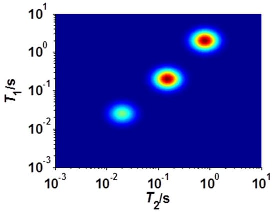 where Y and E with a size of K × I are the measured echo data and noise; the elements of K1 with a size of M × P are ; the elements of K2 with a size of I × J are ; S with a size of P × J is the unknown T1–T2 spectra to solve; superscript T represents the transpose of the matrix.