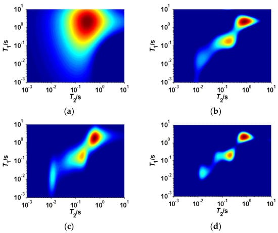 Comparison of the inverted T1–T2 spectra obtained from the four algorithms at SNR = 20. (a–d) represent the results of the TSVD, BRD, LM and TIST algorithms, respectively.