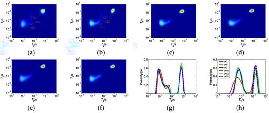 The regularization parameter determines the weight of the residual term and the penalty term in the objective function and plays an important role in T1–T2 spectra inversion. Thus, it is necessary to find the optimal regularization parameter during the T1–T2 spectra inversion. The residuals with different L1 regularization parameters for the compressed echo data were calculated and then the diagram of the logarithmic relationship between the residual and the L1 regularization parameter was plotted, as shown in Figure 10. The corresponding at the red point, where the residual is the minimum, represents the optimal L1 regularization parameter, where . Moreover, five other regularization parameters (0.01, 0.1, 10, 100 and 1000) were tested. The compressed echo data were inverted using the TIST algorithm with the six regularization parameters to obtain the corresponding T1–T2 spectra, as shown in Figure 11a–f. Figure 11g,h show the T2 and T1 spectra from the T1–T2 spectra projections onto the T2 and T1 axes, respectively.
