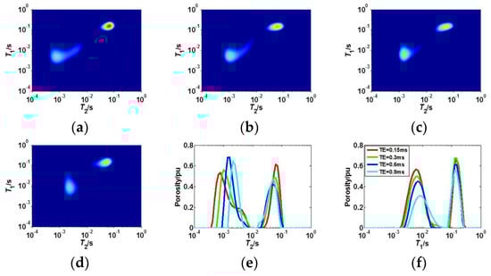 To find the optimal echo spacing for the T1–T2 spectra of heavy oil reservoirs, the wait time group was fixed and the echo spacing was changed, the values of which were 0.15 ms, 0.3 ms, 0.6 ms and 0.9 ms. The echo number was set to int (300 ms/TE) and the sixth wait time group in Table 2 was used. After the experiments, the corresponding echo data with different echo spacings were acquired. Subsequently, the corresponding T1–T2 spectra were obtained using the TIST algorithm after the number of echo data was compressed to 200 by the FSVD method, as shown in Figure 7a–d. Figure 7e,f represent the T2 and T1 spectra from the T1–T2 spectra projections onto the T2 and T1 axes, respectively.