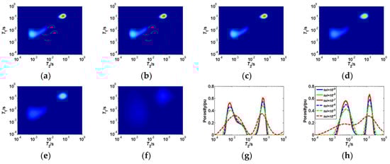 Inverted T1–T2 spectra, T1 spectra and T2 spectra in heavy oil reservoirs with different convergence tolerances. (a–f) represent the inverted T1–T2 spectra with convergence tolerances of 1 × 10−9, 1 × 10−8, 1 × 10−7, 1 × 10−6, 1 × 10−5 and 1 × 10−4, respectively. (g,h) represent the T2 and T1 spectra from the T1–T2 spectra projections onto the T2 and T1 axes, respectively.