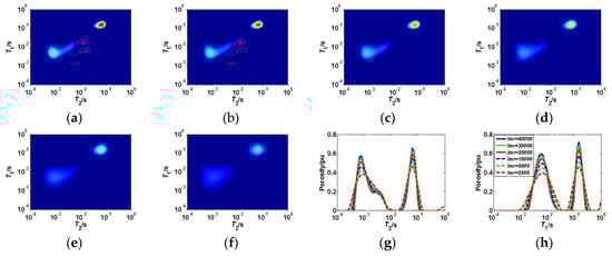 Similar to the convergence tolerance effect, the maximum number of iterations itermax also affects the inversion efficiency. A maximum number of iterations that is too large may result in redundant iterations during the inversion, resulting in time-consuming inversion process. Six different maximum numbers of iterations were set: 40,000, 30,000, 20,000, 10,000, 5000 and 2500. Then, the compressed echo data were inverted using the TIST algorithm with the six maximum numbers of iterations to obtain the corresponding T1–T2 spectra, as shown in Figure 9a–f. Figure 9g,h show the T2 and T1 spectra from T1–T2 spectra projections onto the T2 and T1 axes, respectively. It was evident that the heavy oil signal and the bound water signal gradually diverge in the inverted T1–T2 spectra and their amplitudes gradually decrease with a decrease in the maximum number of iterations. Increasing the maximum number of iterations has no obvious effect on the inversion results when the maximum number of iterations is up to 30,000; the amplitudes of the heavy oil signal and the water signal increase gradually with increase of convergence tolerance. This occurs because the accuracy of the solution is very low for the TIST algorithm when the maximum number of iterations is small. Thus, an itermax of 30,000 was recommended for T1–T2 spectra inversions of heavy oil reservoirs.